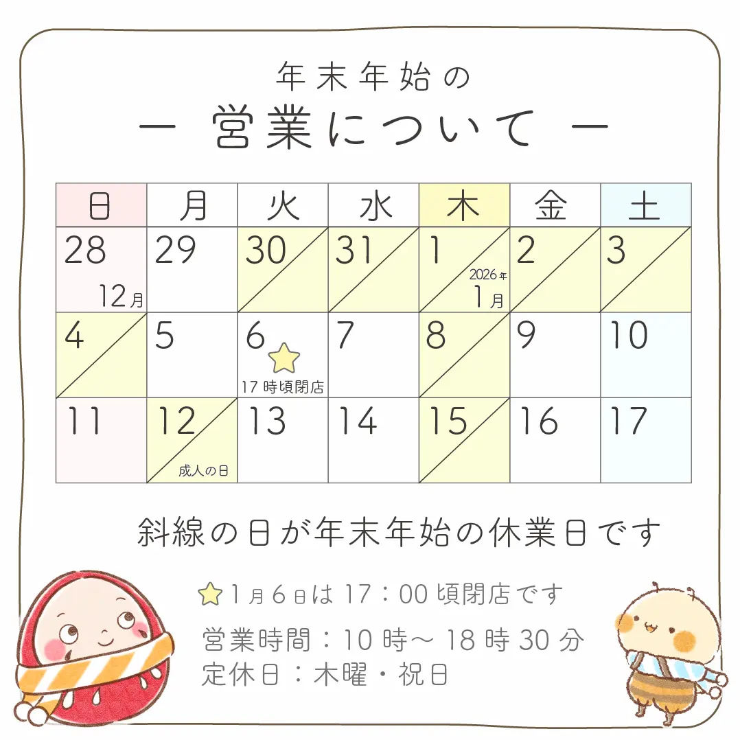 ※ 1月6日(火)は17時頃閉店予定となっております
